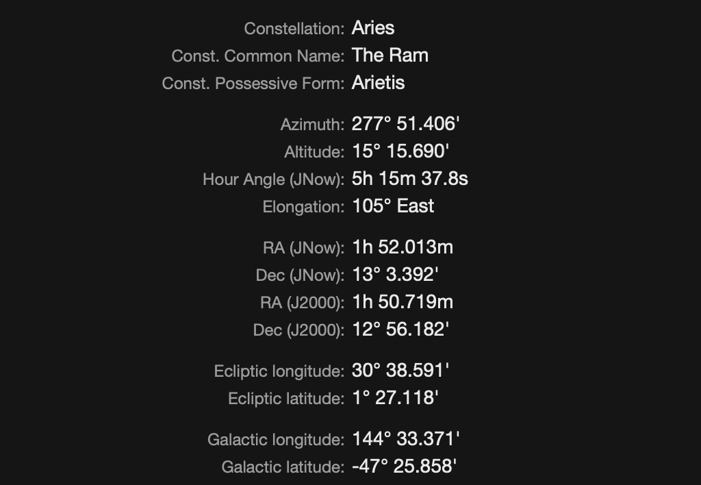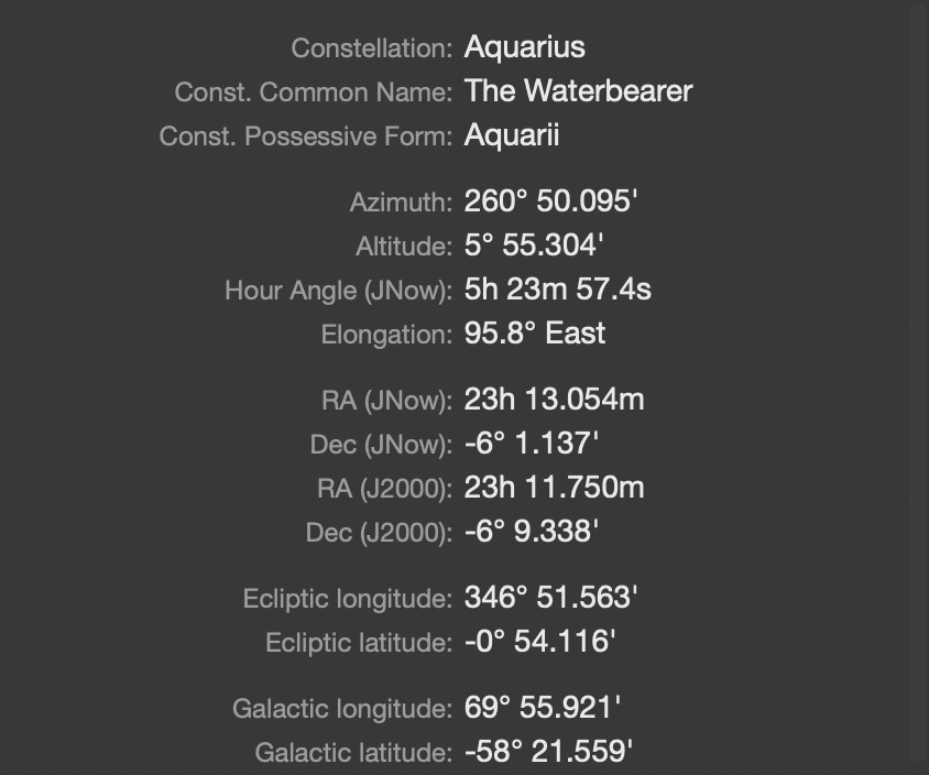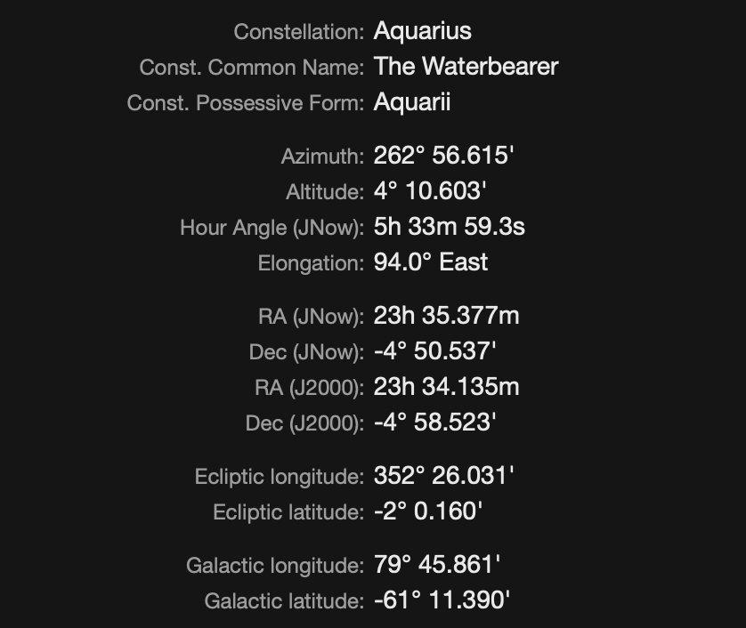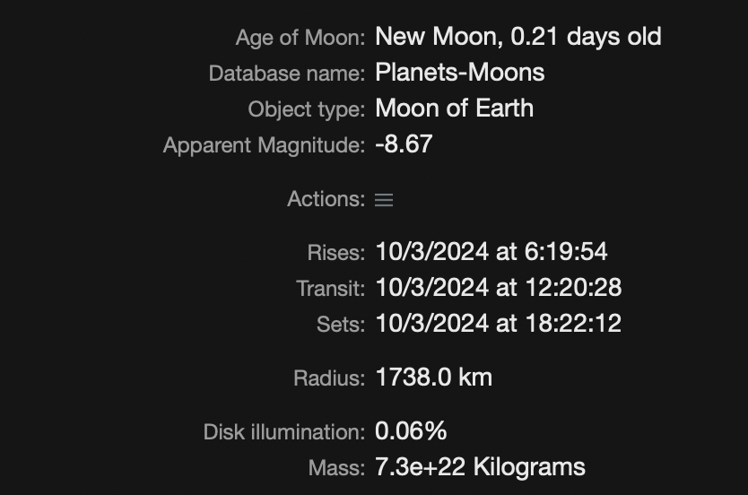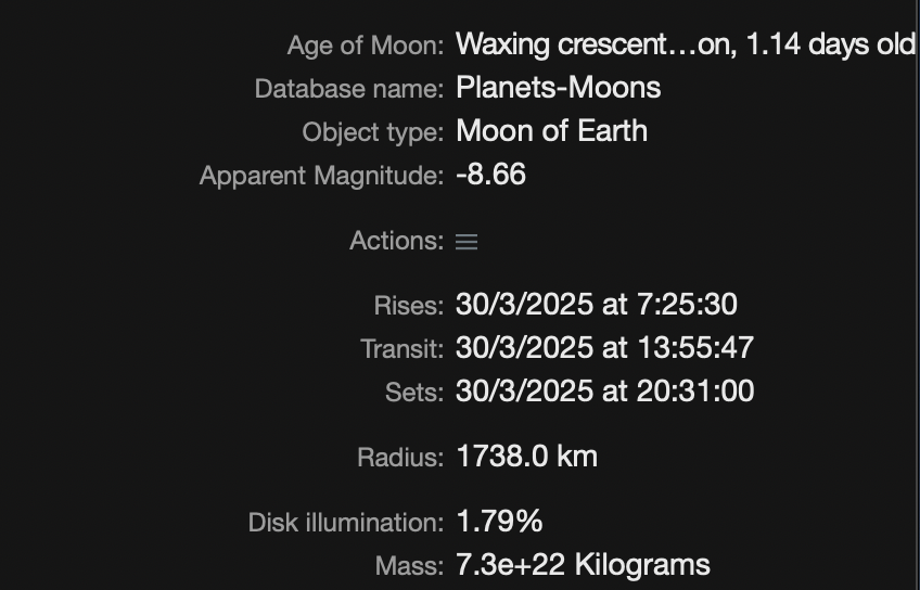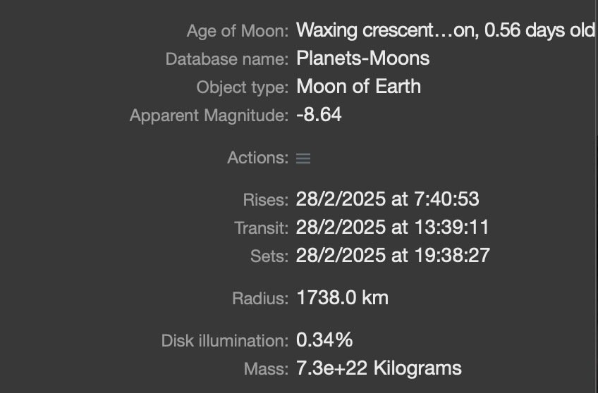Age of Moon: Waxing Crescent : ~ 0.73 days old. = 17.52 hrs old
