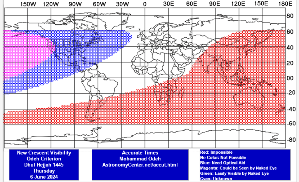 From this report, it is not possible to sight the crescent “Hilal” even with the help of optical Aid (Telescope). Yet might be possible yet challenging through a CCD camera. The chances increase as we move towards the southwest of the globe and or sighting at a higher altitude. However, it all depends on weather conditions at that place and time. Yet because of the Moon age and set time, it will not be possible to sight by naked eyes including with Optical aid. Shaaban will most probably continue its 30 days. InShaAllah (If God wills), this is what I highly presume will happen according to the past reports and practical sightings.