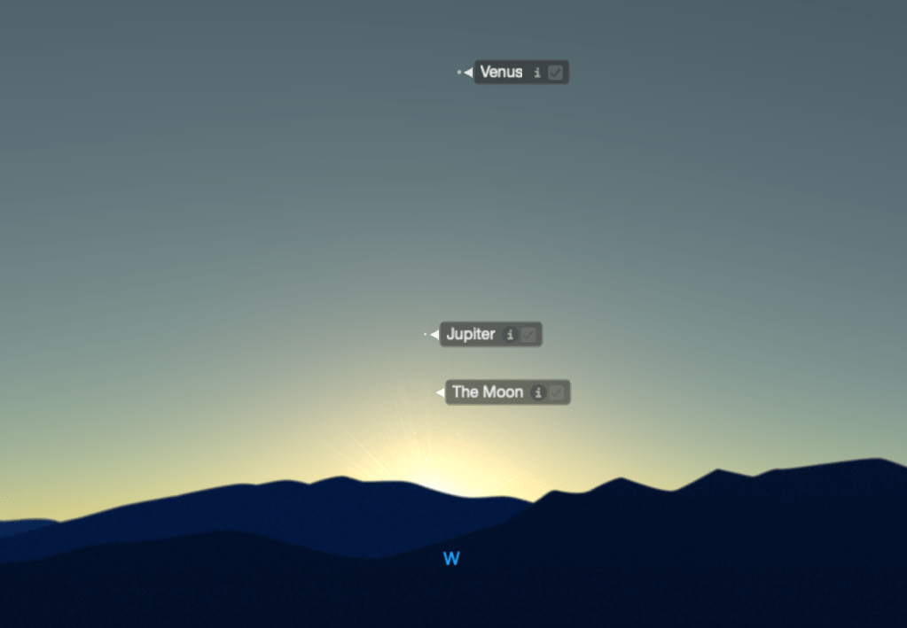 Looking at the sky west after Sunset on 22nd March 2023, the planets Jupiter & Venus are clearly visible above the moon crescent.
