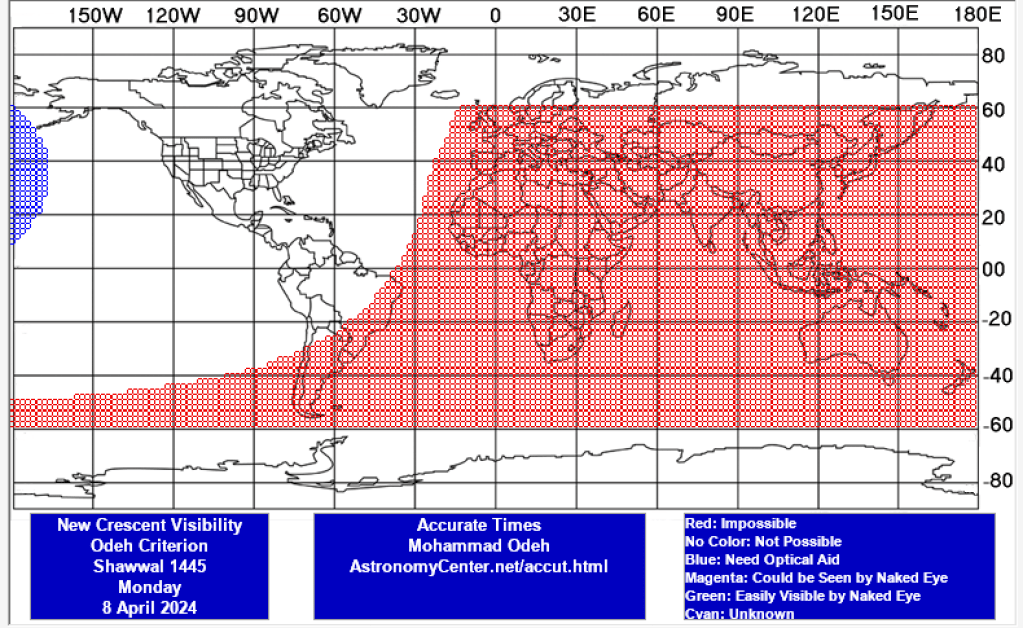 For Info: The Crescent won’t be visible in most parts of the world on 8th April 2024. Sunset in Muscat at 18:24. Moonset at 18:08 UTC+4. Age of Moon 29.22 days old. (Crescent not yet born)